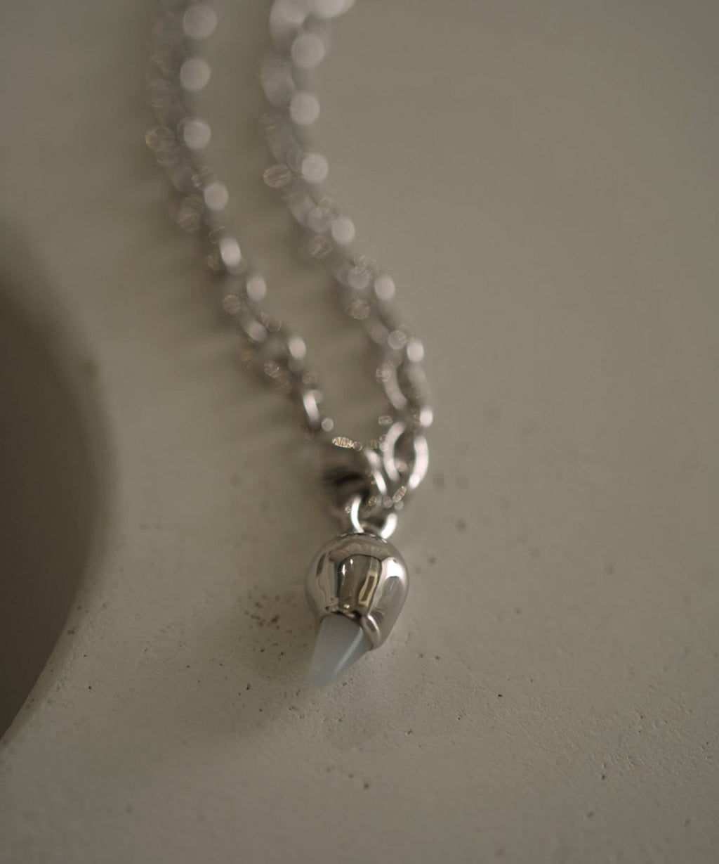 骨や歯を思わせるモチーフにはホワイトアゲートを用い、ブランドオリジナルカットで仕立てました。ほんのりと透ける白は、未完成で成長の途上にある姿を思わせ、曖昧さや儚さを内包しながらも存在感を放っています。